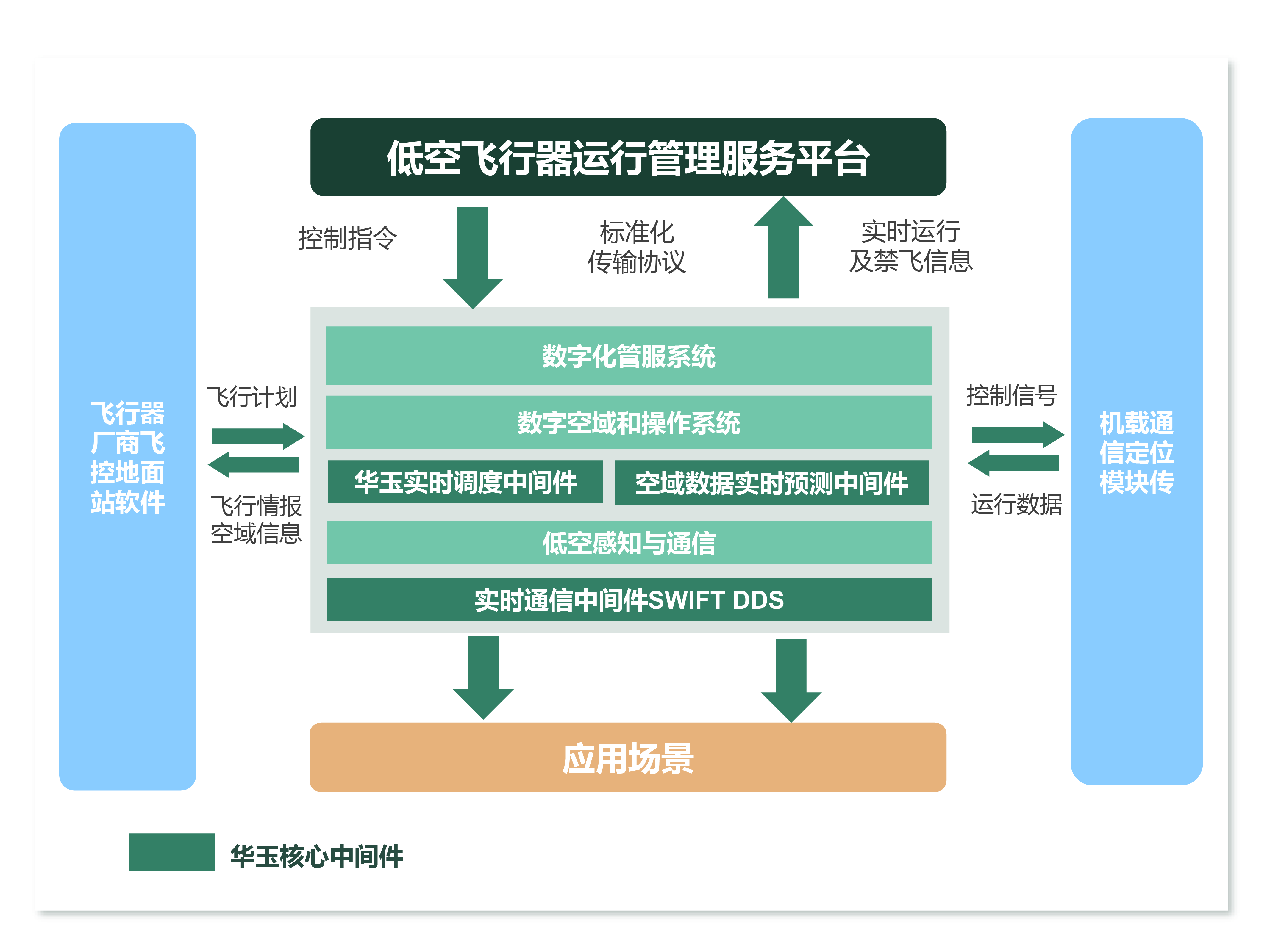 以数据为中心,针对分布式架构,实现低空飞行器运行管理系统中数据传输的实时性、安全性以及确定性,支持上层应用的快速开发和高效部署。